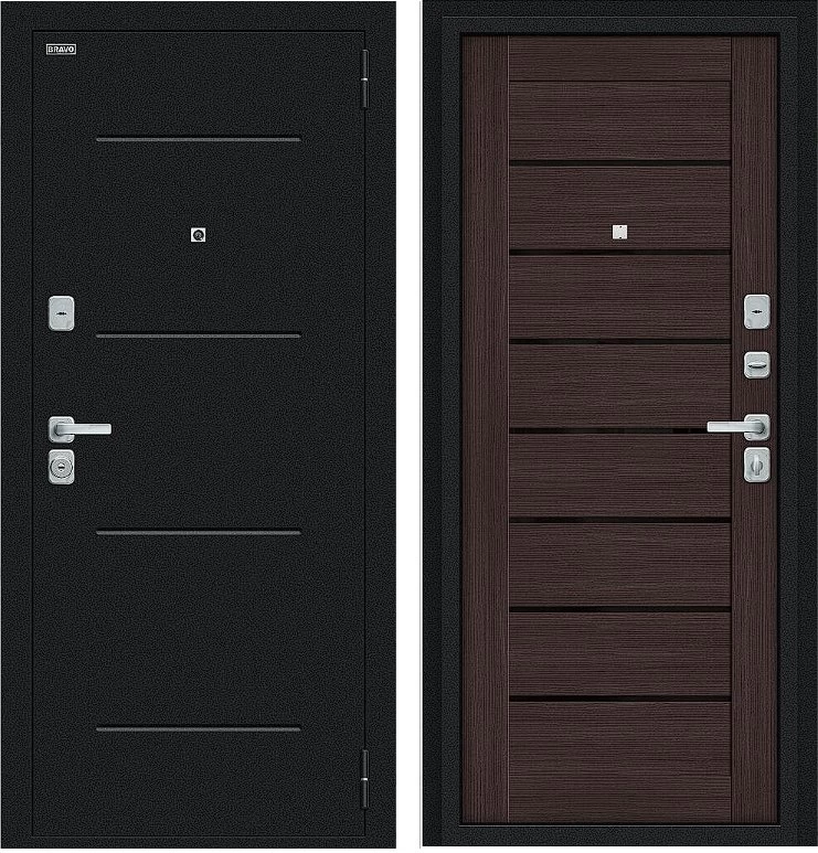 Надежная входная Дверь Браво Техно/BChrome Букле черное/Wenge Melinga премиум класса по цене 34 435 руб. Большая толщина стали защитит от проникновения в ваш дом, квартиру или коттедж. Используется очень качественная фурнитура: замки, цилиндры, ручки, защелки. Покрытие и отделка двери изготовлено под внимательным контролем производителя. Дверь имеет долгий срок службы и гарантию.